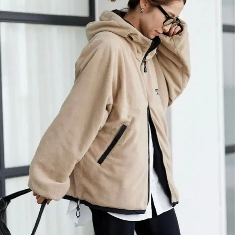 베이지 색상의 플리스 자켓, 후드 부착으로 캐주얼한 스타일에 최적.
