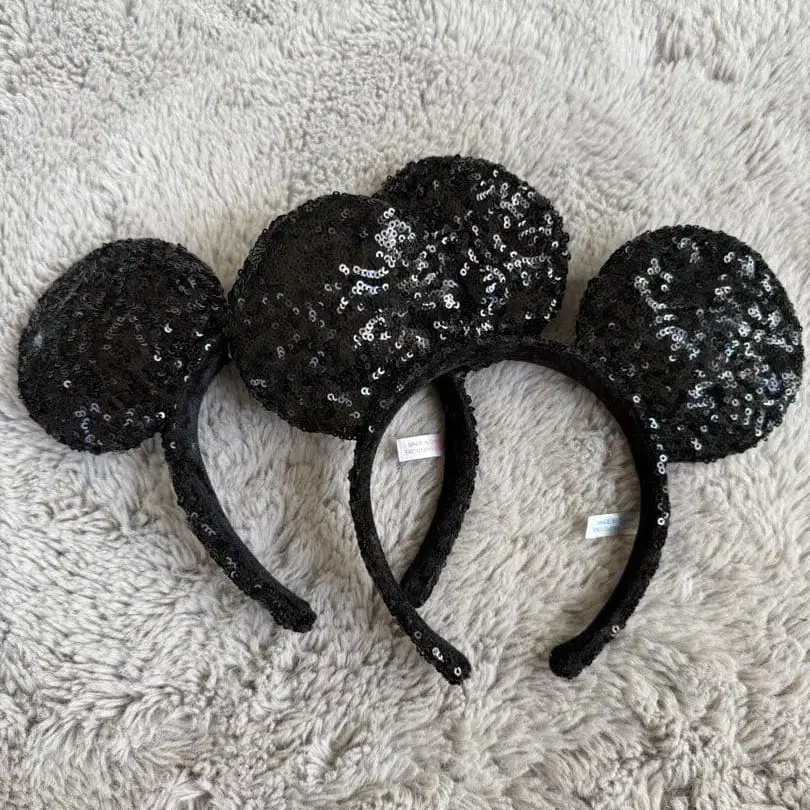 스팽글 미키 머리띠 2개 세트입니다. 한 번 사용한 후 수납 박스에 보관했습니다.