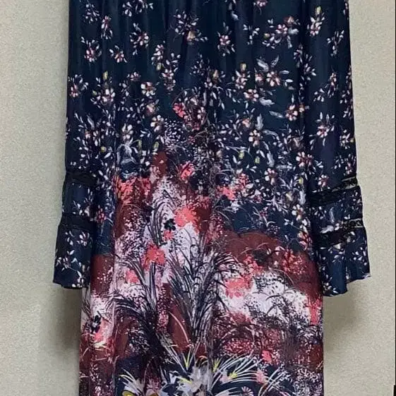 마크스앤스펜서 네이비 꽃무늬 A라인 원피스, 긴팔. 마치 기모노 같은 화려한 꽃무늬와 등 부분의 트임, 그리고 긴 소매 끝의 레이스가 은은하게 비치는 것이 성숙하고 아름답습니다. 소재는 비스코스로 가볍고 부드러우며 주름이 잘 가지 않고, 손세탁이 가능하여 금방 말라 매우 다루기 쉽습니다. 기본적으로는 그냥 입으면 되지만, 옆구리에 지퍼도 달려 있습니다. 안감은 없지만 비치지 않습니다. - 색상: 네이비 - 패턴: 꽃무늬 - 소매 길이: 긴팔 - 장식: 레이스 포함 - 디자인: A라인 사이즈 어깨 너비 39cm 가슴 너비 45cm 소매 길이 60cm 기장 112cm 방문해 주셔서 감사합니다. 색상 - 네이비 계열 패턴 - 꽃무늬 얼룩, 찢김, 냄새 등 - 없음