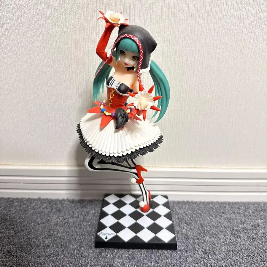 미쿠 댄스 피규어, 프릴 달린 의상과 체커 베이스가 특징. - 캐릭터: 미쿠 - 색상: 블랙, 빨간색, 화이트, 그린 - 디자인: 의상에 프릴과 리본이 있음 - 베이스: 체커 패턴의 받침대 - 포즈: 한쪽 다리를 올린 댄스 포즈 - 헤어스타일: 트윈 테일 - 소재: PVC 방문해 주셔서 감사합니다.