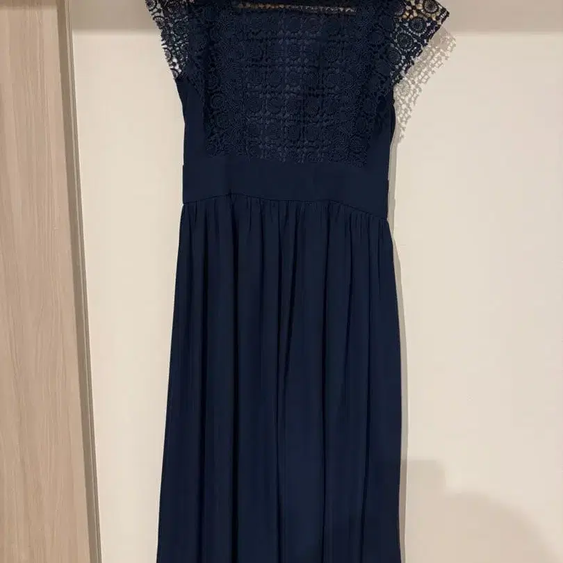 엘레강트한 네이비 레이스 드레스, 포멀이나 파티에 최적. 4년 전에 구매하여 2회 정도 파티에서 사용했습니다. 그 이후에는 옷장에서 보관. 슬리브리스에 허리가 조여져 있어 매우 귀엽습니다.