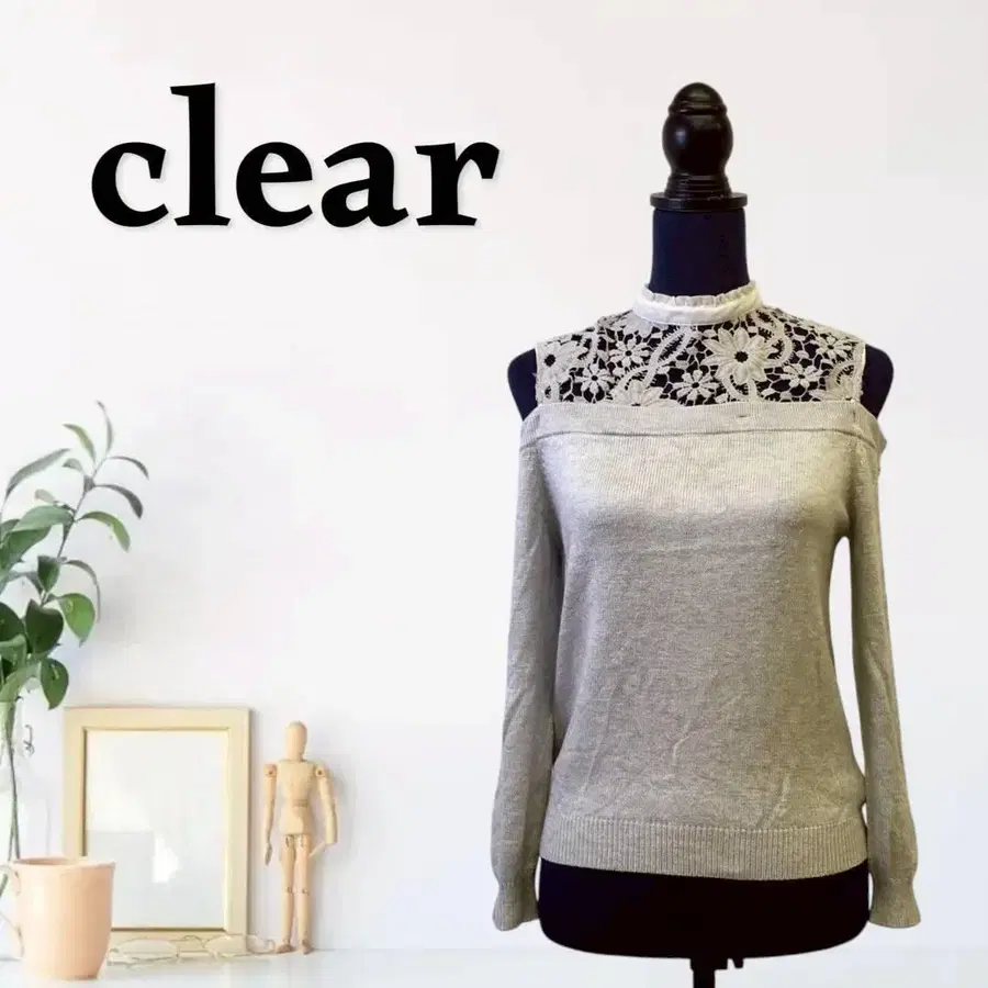 목 뒤 스냅 버튼, 레이스 부분 비침 있음, 니트, 신축성 있음, 어깨 슬릿, 소매 길이 슬릿 포함하지 않음.