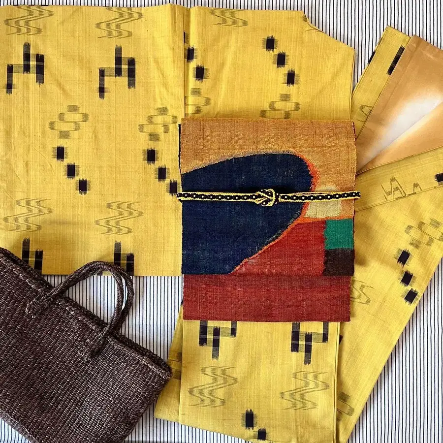 紬 기모노 이중 기모노 옐로우 컬러 류큐 무늬 순수 실크