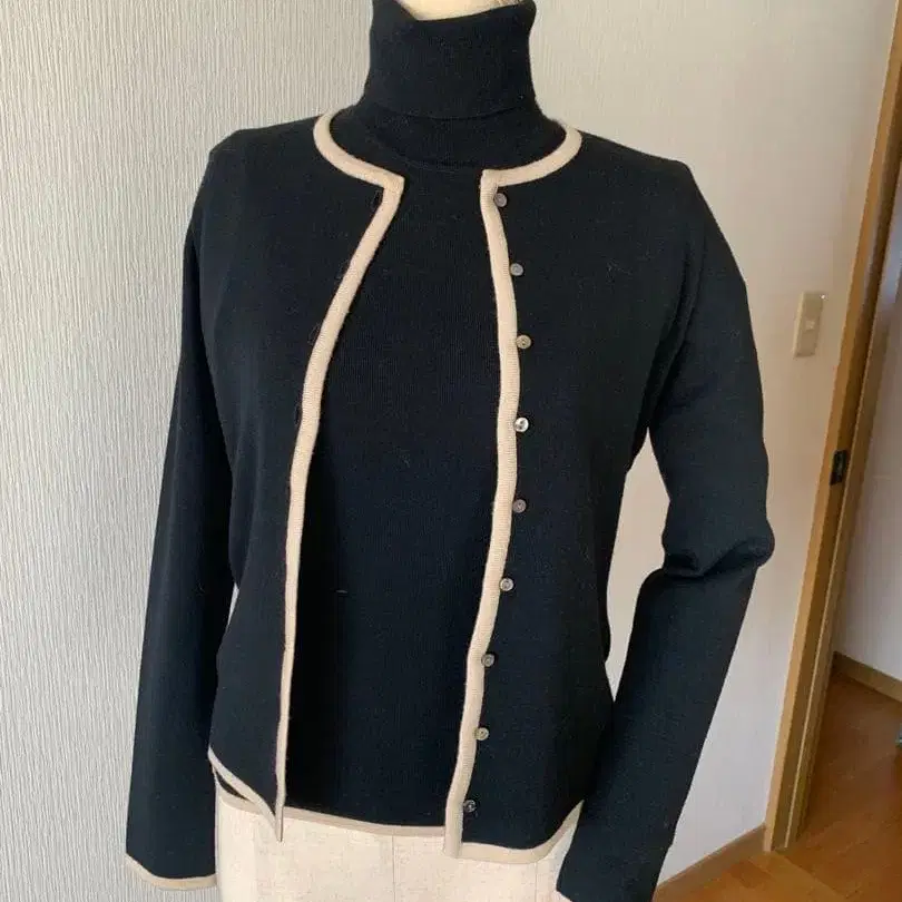 자동 번역되었어요. 원문보기핏감 있는 블랙 터틀넥 니트와 앞 버튼이 달린 가디건 앙상블