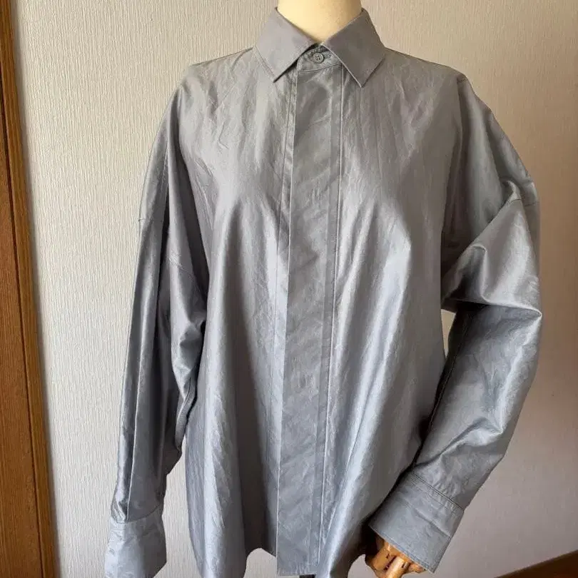 자동 번역되었어요. 원문보기투모로우랜드, 갤러리 비의 오버사이즈 블루 그레이 긴팔 셔츠, 버튼 업 디자인