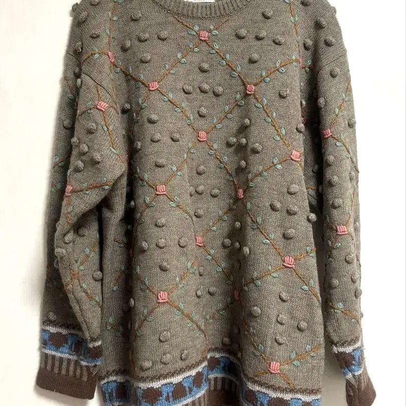 자동 번역되었어요. 원문보기입체적인 도트와 자수가 특징인 브라운 니트 스웨터입니다.