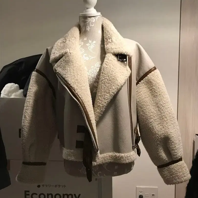 자동 번역되었어요. 원문보기쉘 퍼와 합성 피혁의 캐주얼한 숏 기장 무스탕 코트.