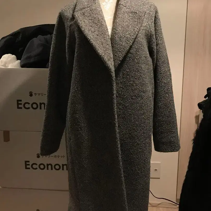 자동 번역되었어요. 원문보기텍스처가 있는 그레이 롱 코트, 앞면에 버튼. 포켓 2개 포함.
