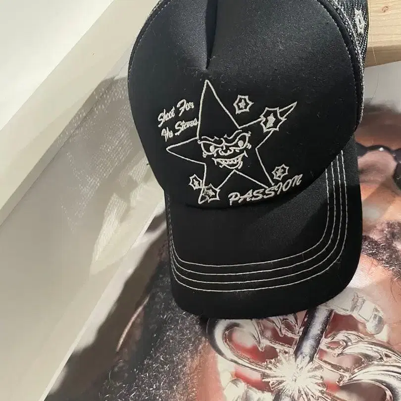 별 모양 그래픽과 텍스트가 특징인 블랙 캡. - 색상: 블랙 - 디자인: 별 모양 그래픽과 텍스트 - 텍스트: Just For The Stars, PASSION 방문해 주셔서 감사합니다.