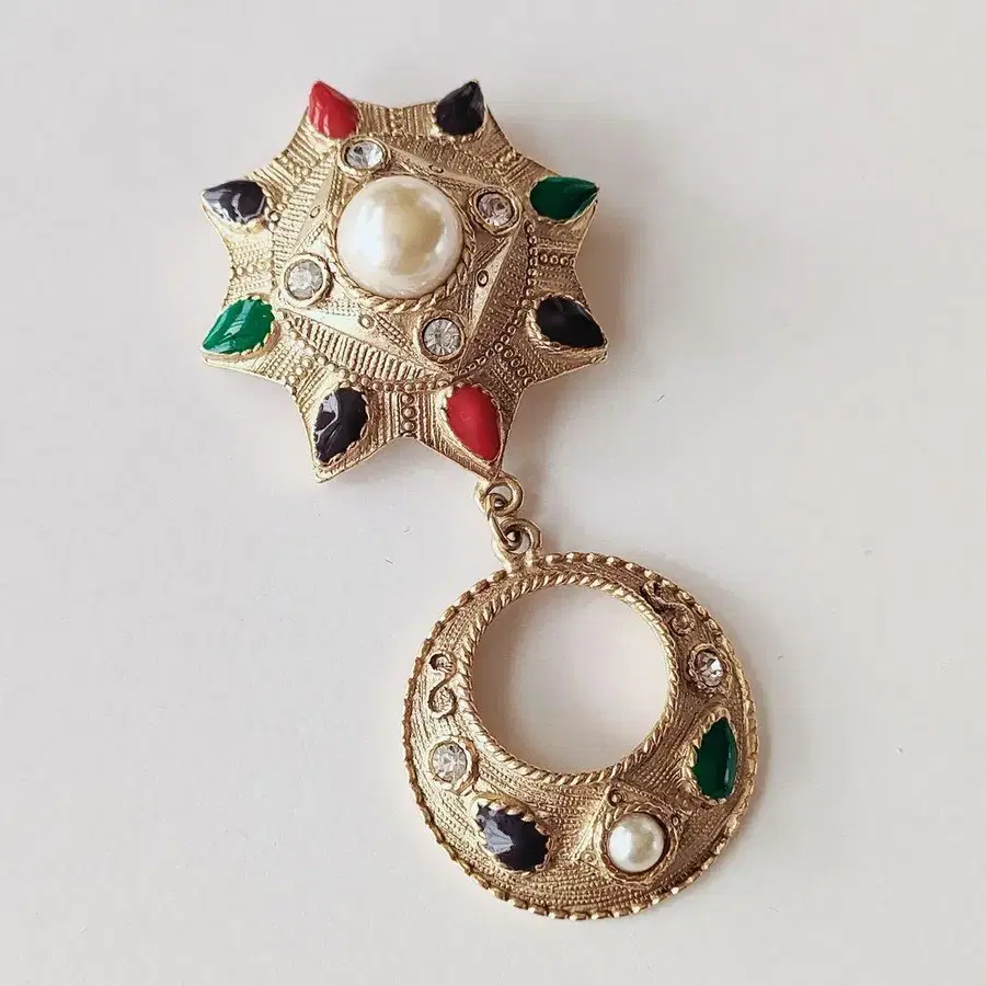 중앙의 큰 펄과 반짝이는 비쥬를 호화롭게 장식한 화려한 디자인의 브로치입니다.