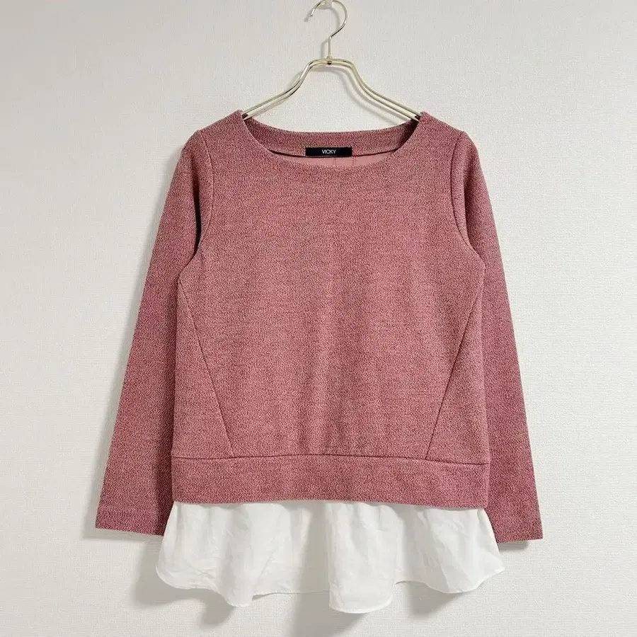 핑크 니트와 화이트 플레어 밑단이 특징인 레이어드 스타일의 긴팔 상의.