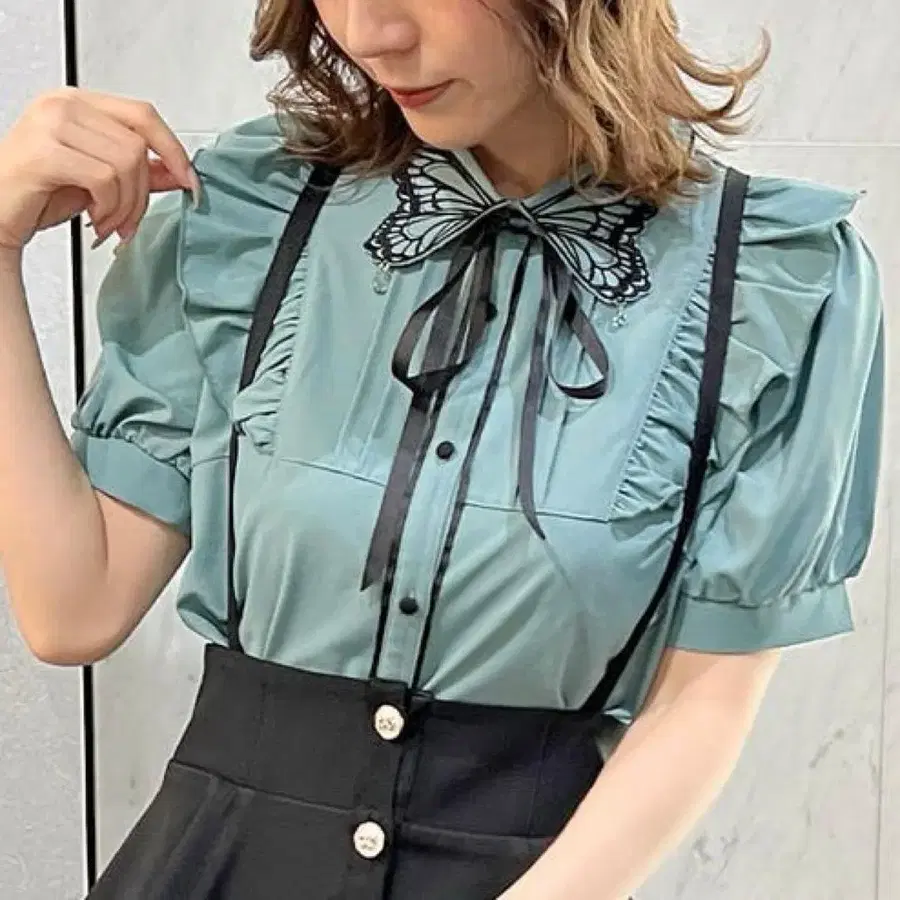 옷깃에 장식된 나비 자수가 눈길을 끄는 블라우스입니다.