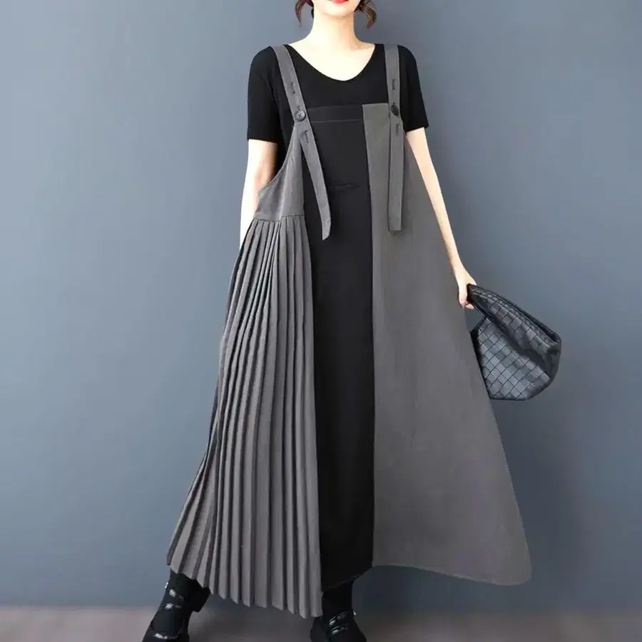 블랙 x 그레이 투톤 컬러가 시선을 사로잡는 플리츠 디자인의 살로펫 원피스입니다 ♪