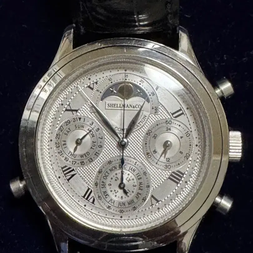자동 번역되었어요. 원문보기Shellman&Co의 그랜드 컴플리케이션 손목시계입니다. 다이얼에는 월령 표시와 요일, 날짜, 월이 표시되어 있어 다기능 디자인이 특징입니다. 벨트는 다크 네이비 색상의 악어 가죽으로, 전체적으로 차분한 인상입니다.