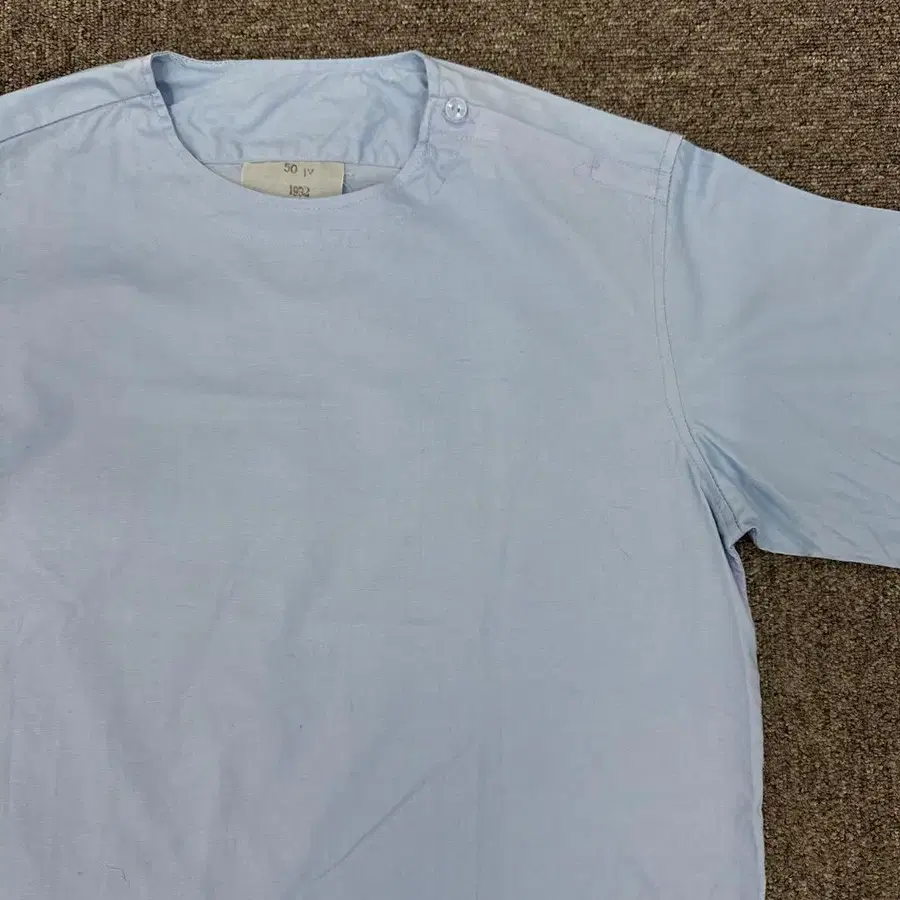 스카이블루 색상의 긴팔 라운드넥 셔츠, 버튼이 있어 스타일리시합니다.