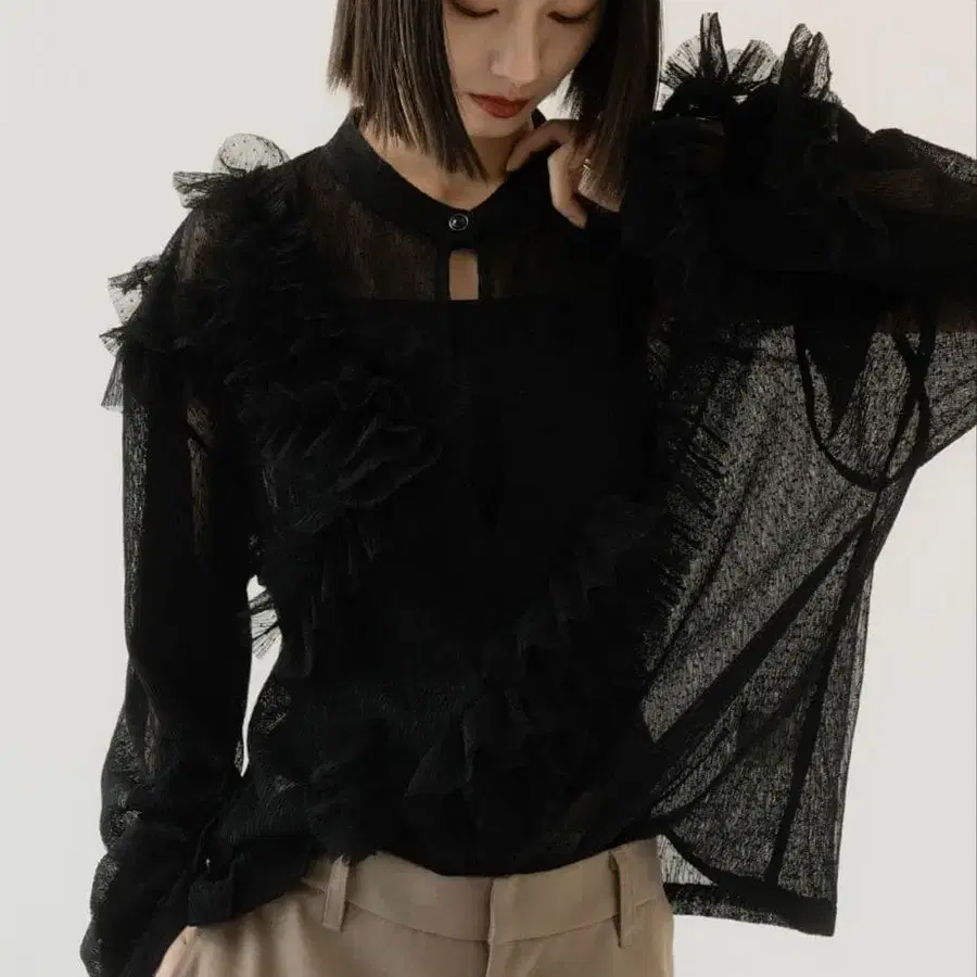 어깨와 소매에 랜덤으로 더해진 프릴 디자인으로 어른스러운 꾸밈.