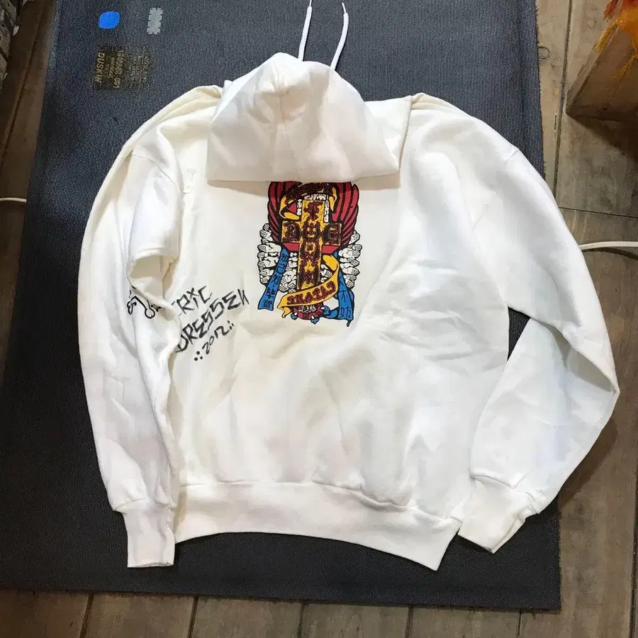자동 번역되었어요. 원문보기화이트 후드티에 ERIC DRESSEL의 그래픽 프린트가 적용된 디자인.