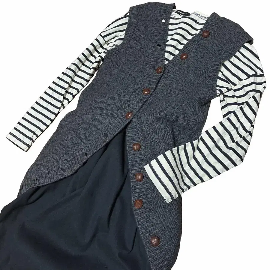 자동 번역되었어요. 원문보기9개의 버튼이 달린 독특한 디자인의 니트 베스트입니다.