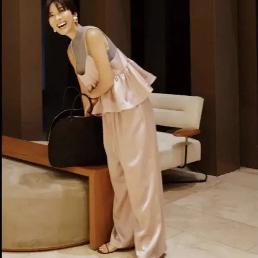 고급스러운 광택감이 매력적인 새틴 와이드 팬츠입니다. 부드럽고 드레이프성이 있는 원단으로, 입는 것만으로도 성숙한 인상을 줍니다.