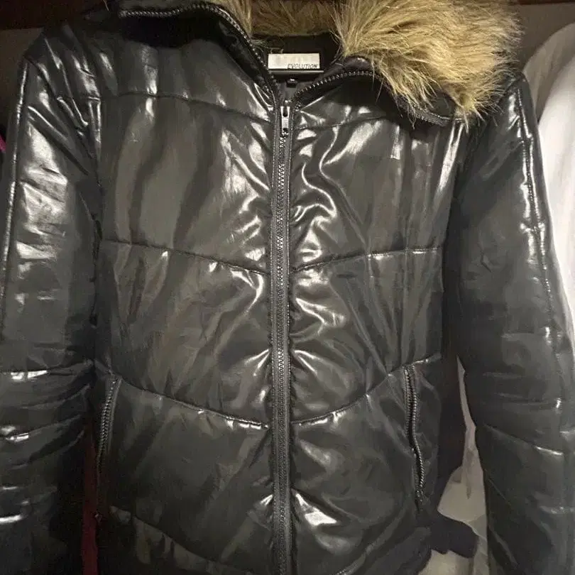 광택이 나는 블랙 다운 자켓, 퍼가 달린 후드로 스타일리시합니다. 사이즈는 L이지만 기장은 S 사이즈 정도입니다. - 색상: 블랙 - 소재: 광택이 나는 소재 - 후드: 퍼가 달린 후드 - 디자인: 퀼팅 디자인 방문해 주셔서 감사합니다.