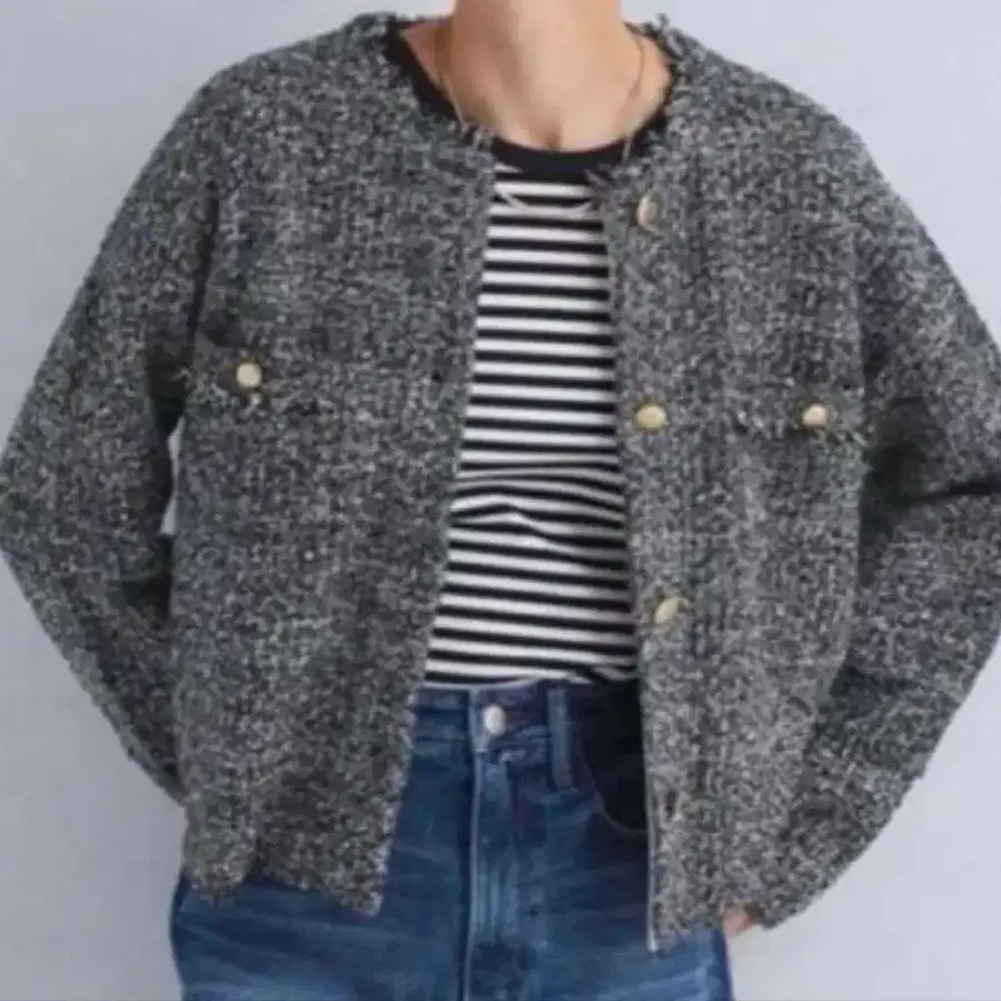 자켓처럼 입을 수 있는 가디건. 컴팩트한 기장으로 트렌디한 밸런스를 완성했습니다. 빅 사이즈 메탈 버튼과 목둘레, 포켓 부분의 프린지 디테일이 포인트입니다. 격식 있는 느낌이면서도, 툭 걸치기만 해도 코디네이트가 화려해지는 한 벌입니다.