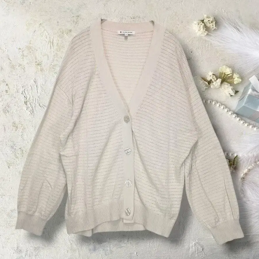 ☘️ 글로벌 워크의 베이지 V넥 가디건, 버튼 디자인, 니트 직물.