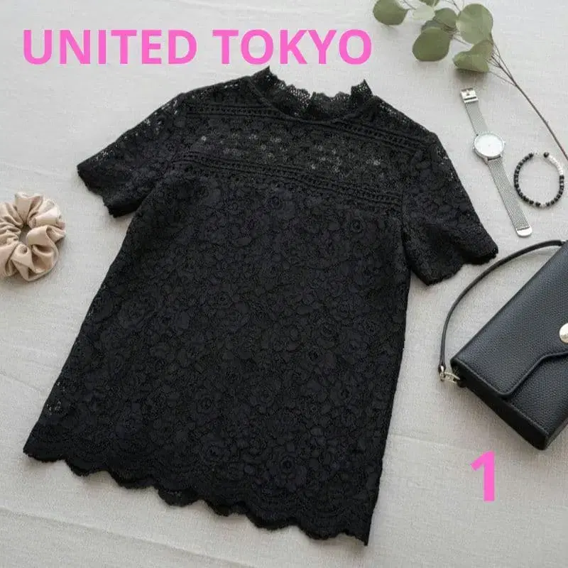 UNITED TOKYO 꽃무늬 레이스 하이넥 상의 블랙 티어드 프릴