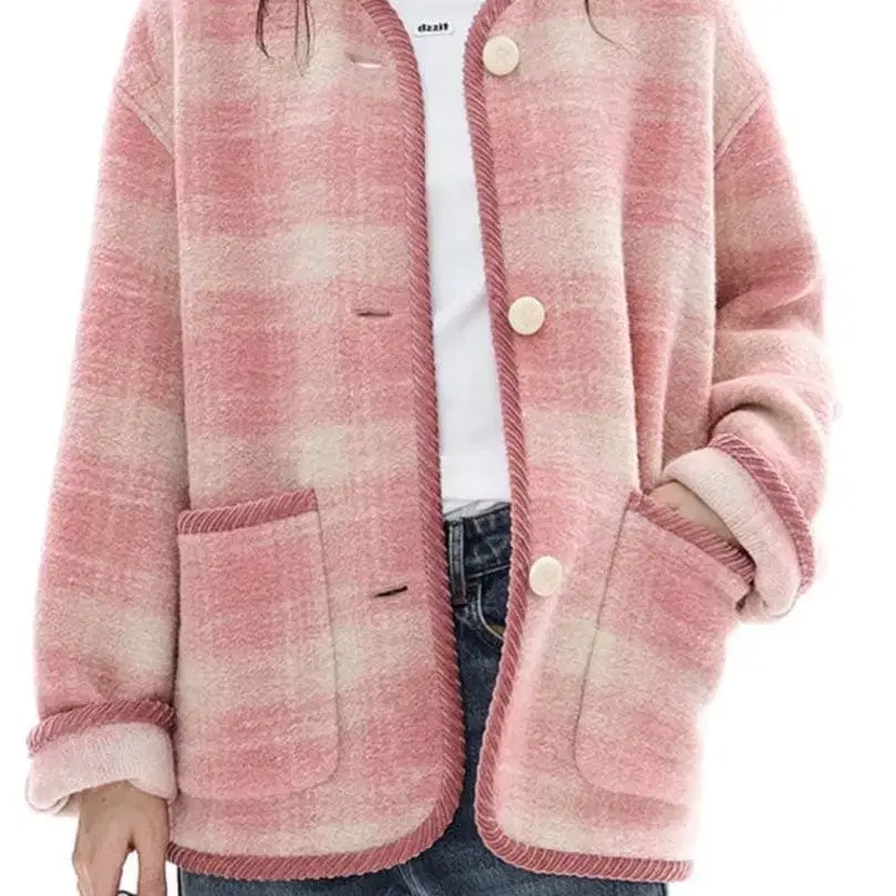 D'ZZIT 파이핑 디자인 핑크 플래드 코트