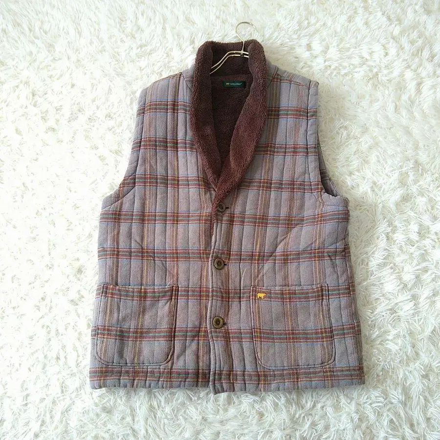 ☑ 상품: 브라운 계열 체크 L 사이즈 베스트, 버튼과 포켓이 있습니다.