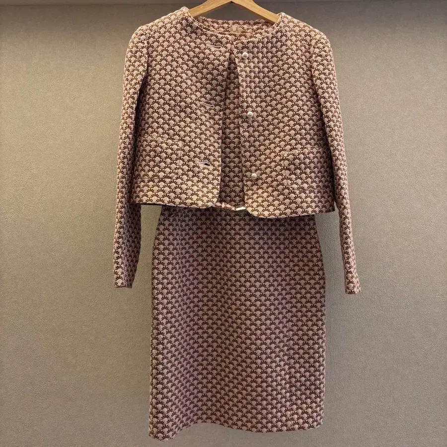 자동 번역되었어요. 원문보기49 av.junko shimada (준코 시마 다)의 셋업으로, 고급스러운 핑크 x 브라운의 자카드 패턴이 눈길을 끄는 화려하고 고급스러운 한 벌입니다.