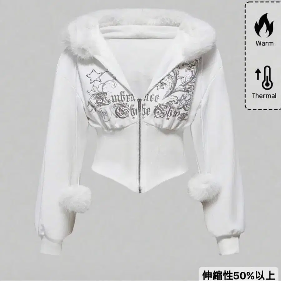 퍼가 달린 후드와 장식적인 프린트가 특징인 화이트 후드티. - 색상: 화이트 - 디자인: 퍼가 달린 후드, 프론트 지퍼, 장식적인 프린트 - 소재: 신축성 50% 이상 - 특징: 보온성, 서멀 방문해 주셔서 감사합니다.