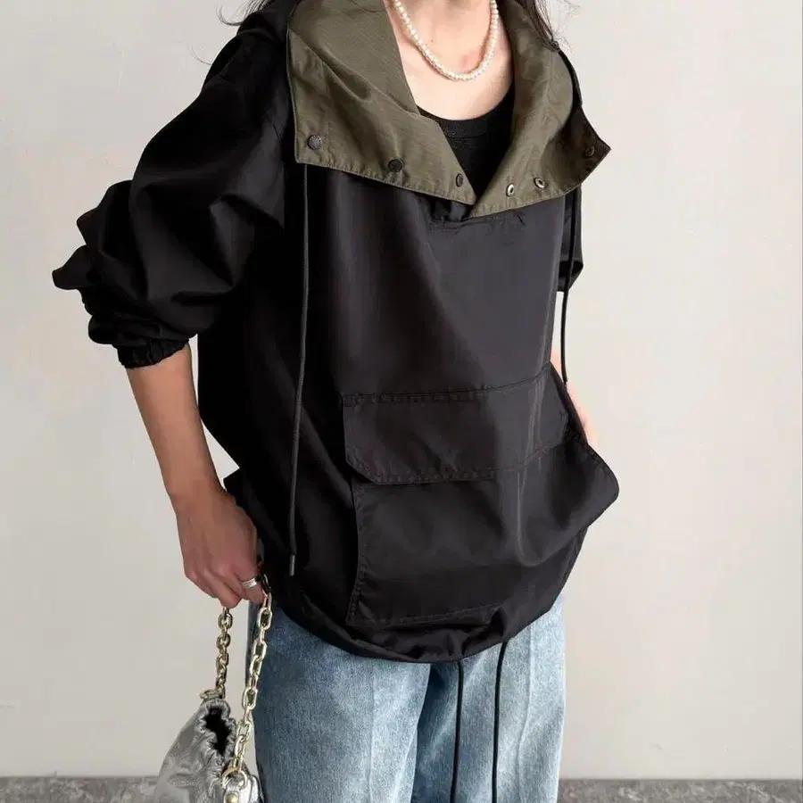금속 버튼 + 끈을 악센트로, 얇은 후드티처럼 걸치기 좋습니다.