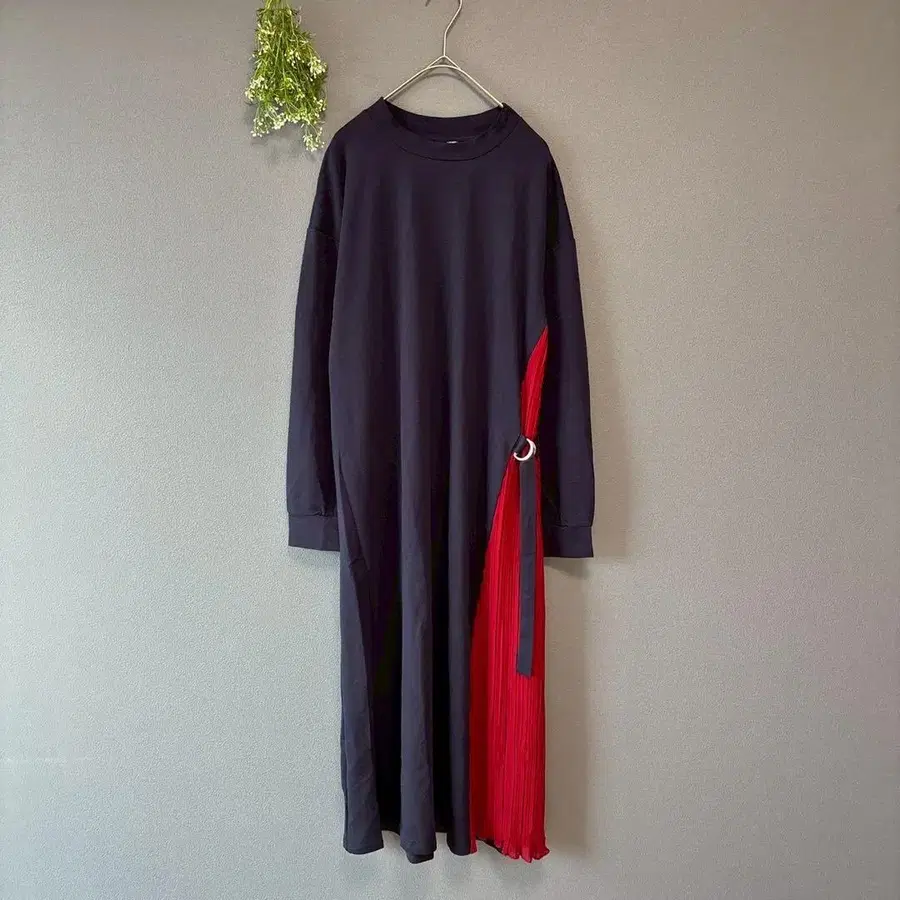 네이비의 차분한 베이스에 깊이 있는 레드 플리츠가 돋보이는 도킹 디자인의 롱 원피스.