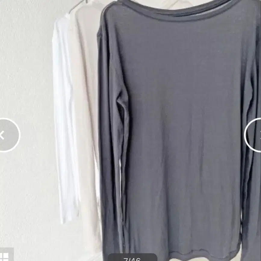 약간 긴 소매 길이, 몸의 라인을 드러내지 않는 사이즈감, 쇄골이 예쁘게 보이는 보트넥 디자인입니다.