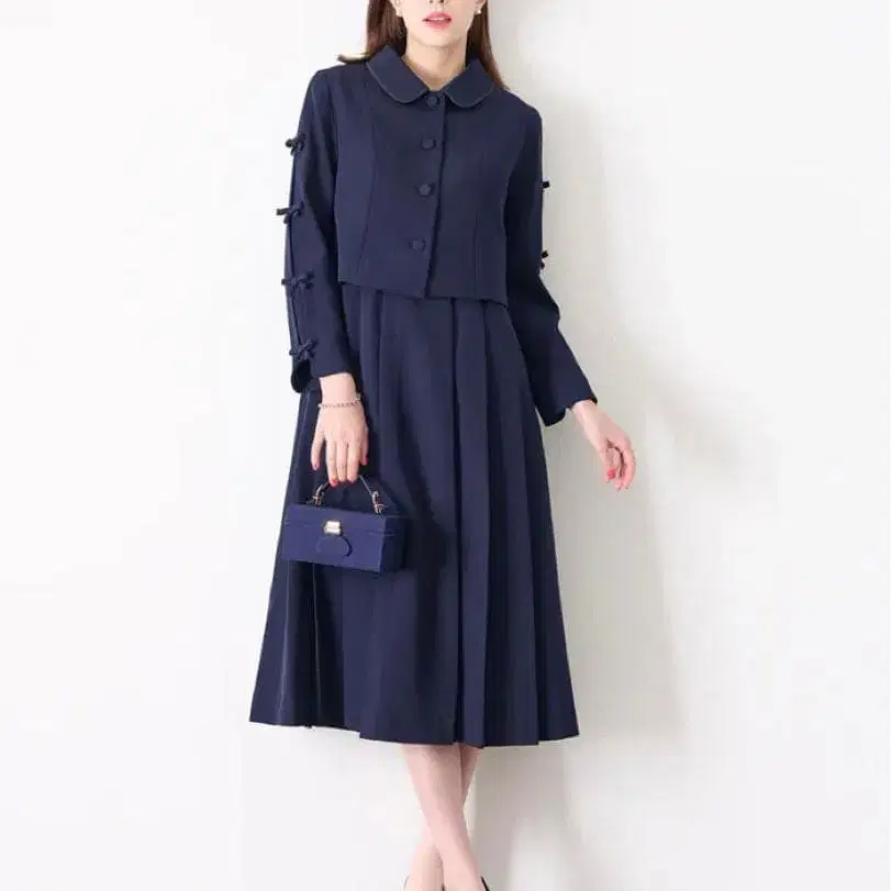 입는 것만으로도 우아한 분위기를 연출해 주는 엘레강트한 자켓과 원피스 셋업. 옷깃을 따라 파이핑이 고급스러운 성인 스타일을 돋보이게 해주는 자켓은, 소매 라인을 따라 입체적인 리본 모티브를 더해 사랑스러운 악센트를 플러스했습니다. 가슴 부분에 나란히 있는 펄이 시선을 사로잡는 원피스는, 가슴 밑의 개더와 높은 위치의 허리 절개 라인이 스타일업을 완성하며, 깔끔하게 재단된 허리와 턱이 만들어내는 아름다운 형태가 화려하면서도 차분한 분위기를 연출합니다. 돌려입기 좋은 베이직한 네이비와 그레이 두 가지 색상으로 준비했습니다.