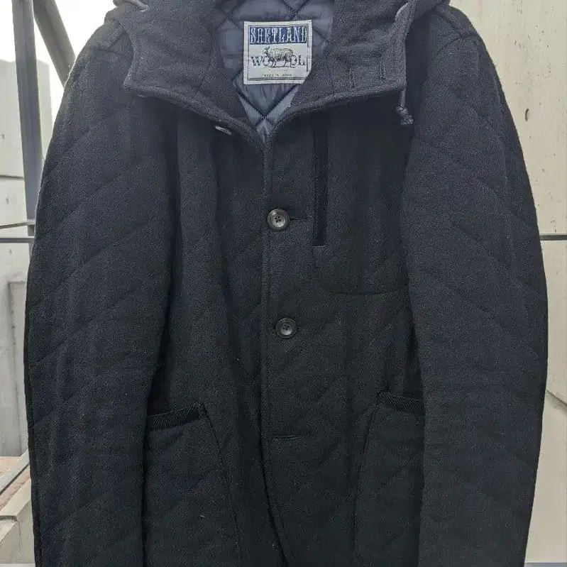 울 100% 소재의 후드 부착 퀼팅 자켓.