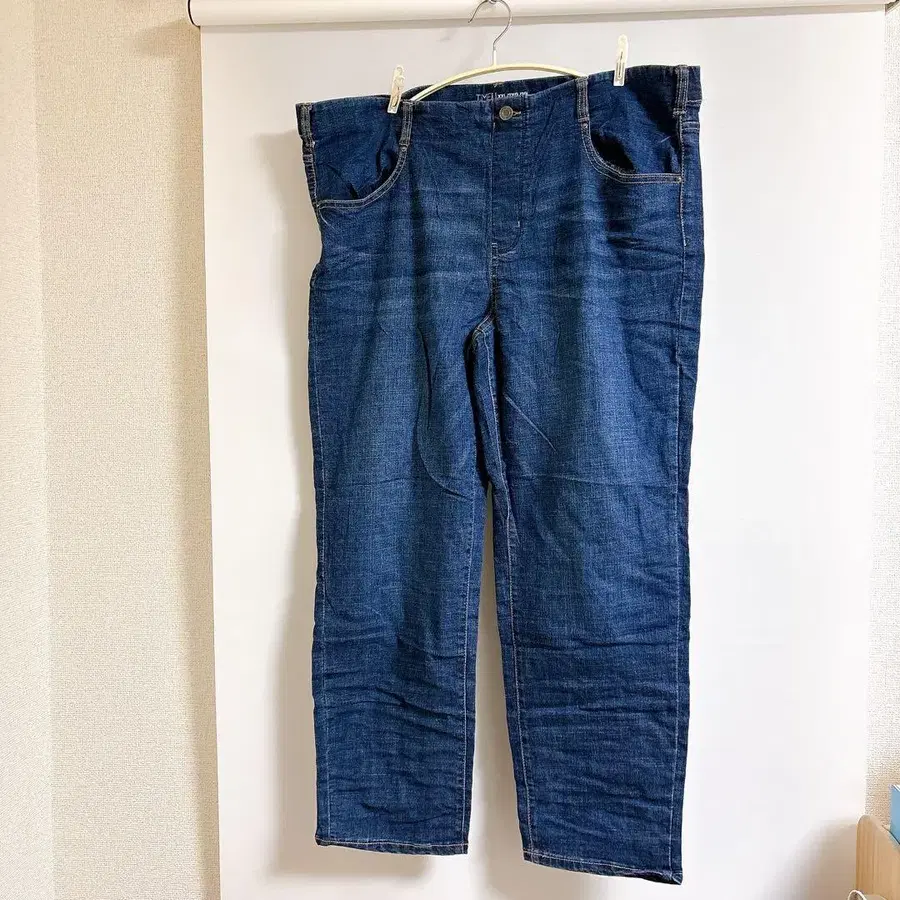 자동 번역되었어요. 원문보기다크 블루 스트레이트 데님 팬츠, 하이웨스트 디자인에 앞 포켓 포함.