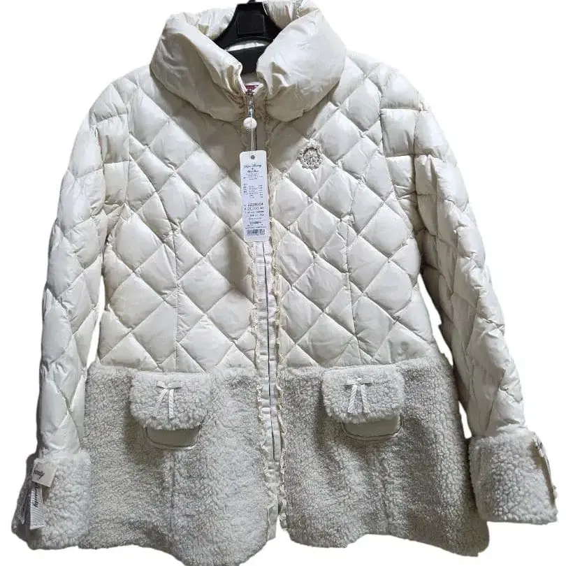 자동 번역되었어요. 원문보기퀼팅 디자인의 베이지 다운 자켓, 리본 포함으로 귀여운 스타일.