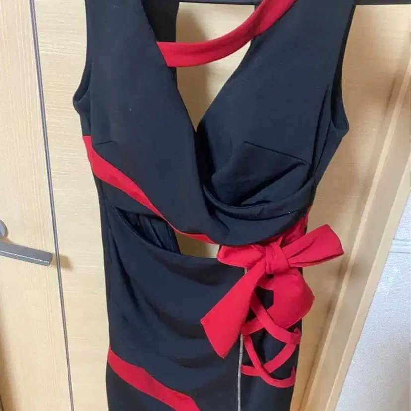 블랙과 빨간색의 타이트 드레스 허리 리본 포함