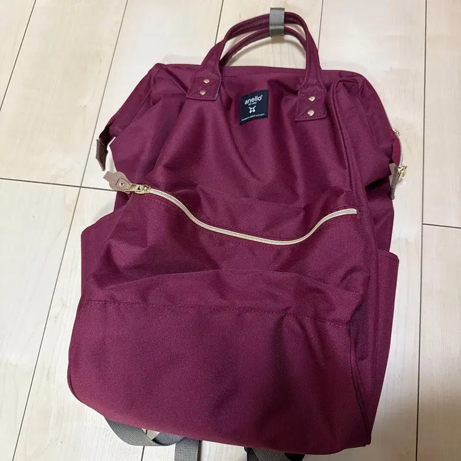 버건디 색상의 백팩으로, 내부 포켓이 여러 개 있으며 메탈 지퍼를 사용했습니다.