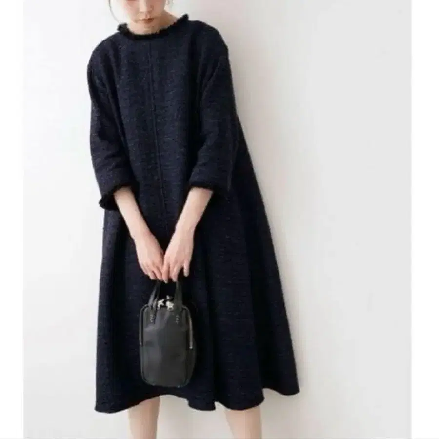 굵기가 다른 리본 같은 실로 짜인 트위드풍 자카드 조직의 소재가 특징적인 원피스.