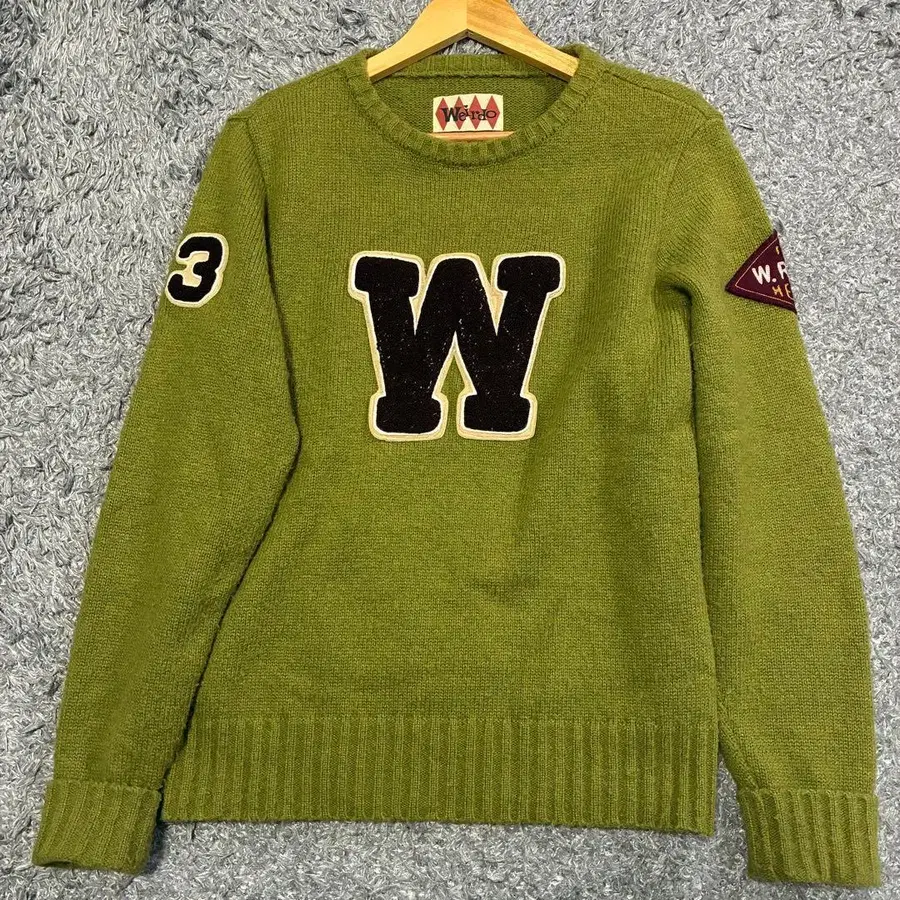 프론트에는 존재감 있는 [ W ] 와펜, 왼쪽 소매에 [ 23 ], 오른쪽 소매에 브랜드 와펜을 배치하여 빈티지 레터드 스웨터를 연상시키는 디자인입니다.