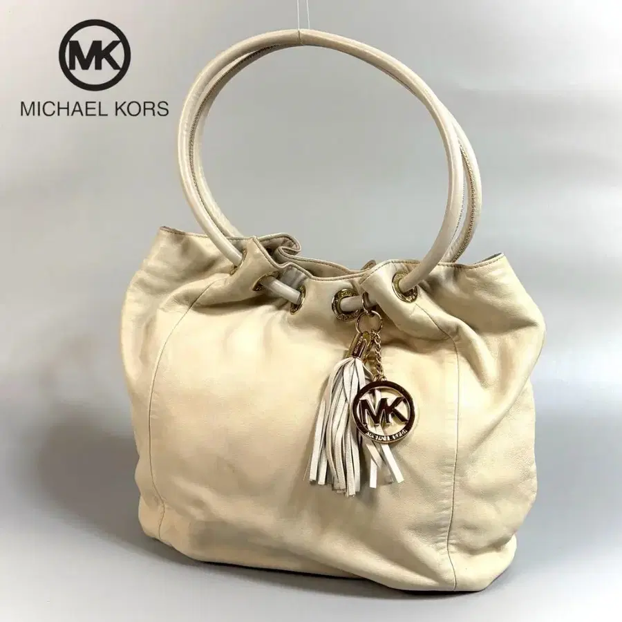 자동 번역되었어요. 원문보기[ 새상품급 ] MICHAEL KORS 마이클코어스 가죽 복조리 핸드백 토트백 숄더 프린지 화이트 참 포함