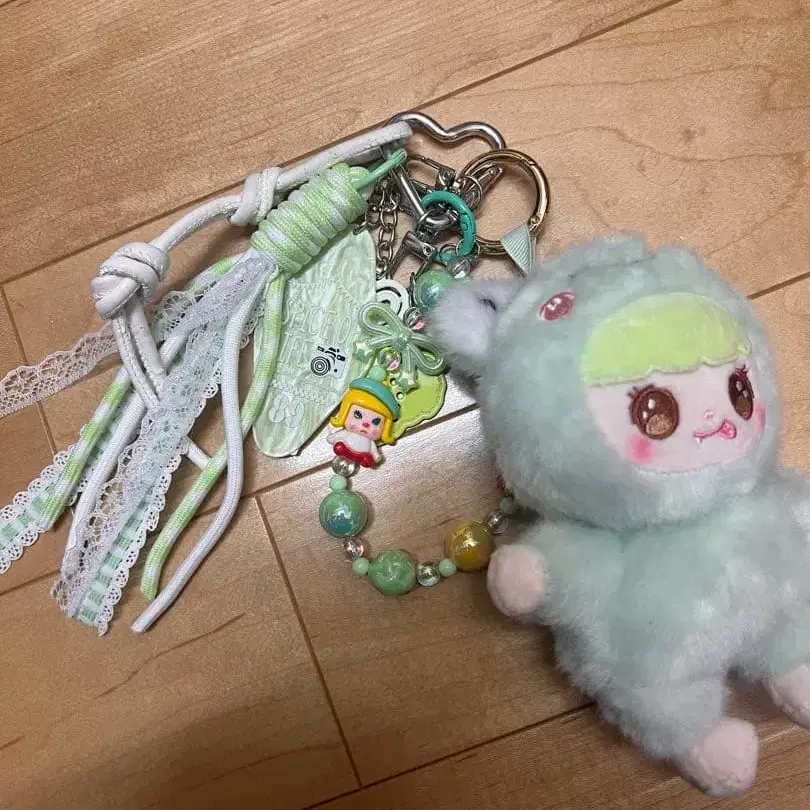 푹신푹신한 민트 그린 색상의 캐릭터 키링. - 색상: 민트 그린 - 소재: 봉제 인형 - 디자인: 캐릭터 키링 - 액세서리: 비즈 스트랩 - 특징: 푹신푹신한 질감 - 사이즈: 약 10cm - 부속품: 스트랩 포함 방문해 주셔서 감사합니다.