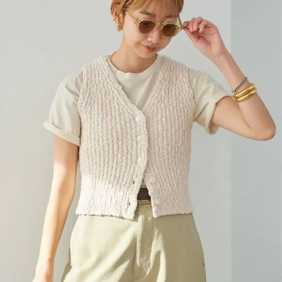 입체감이 있는 짜임이 특징인 로우게이지 니트 베스트.