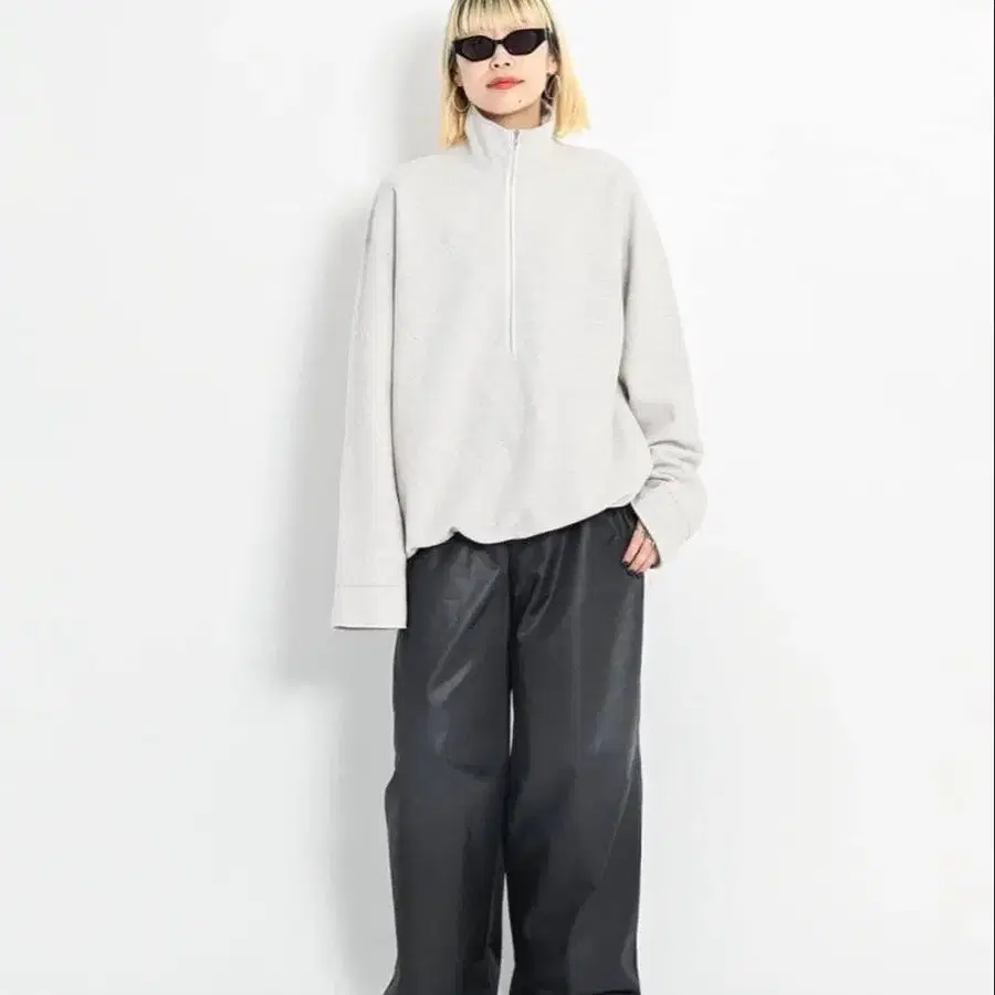 가죽 같은 질감이 있는 원단으로, 캐주얼하면서도 세련된 인상을 주는 존재감 있는 와이드 팬츠입니다.