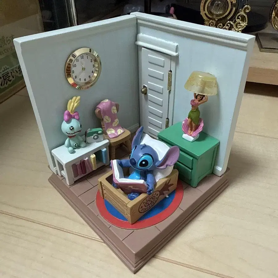 스티치가 책을 읽고 있는 실내 장면 피규어. - 캐릭터: 스티치 - 디자인: 실내 장면 - 액세서리: 시계, 램프, 가구 - 소재: 플라스틱 - 사이즈: 약 15cm x 15cm 방문해 주셔서 감사합니다.