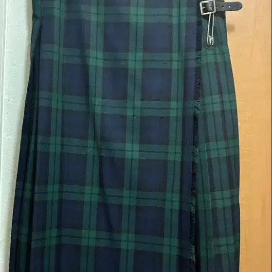 네이비와 그린 체크 무늬의 플리츠 스커트, 사이드 버클 포함.