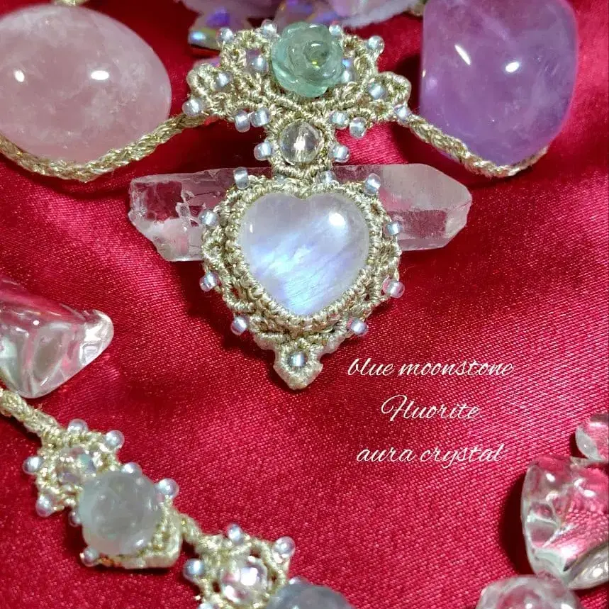 자동 번역되었어요. 원문보기✩ 블루문스톤 ♡ 하트 (페리스테라이트)와 탑, 코드 엔드에 플로라이트 장미 조각과 아우라 크리스탈을 사용한 마크라메 뜨개 목걸이입니다.
