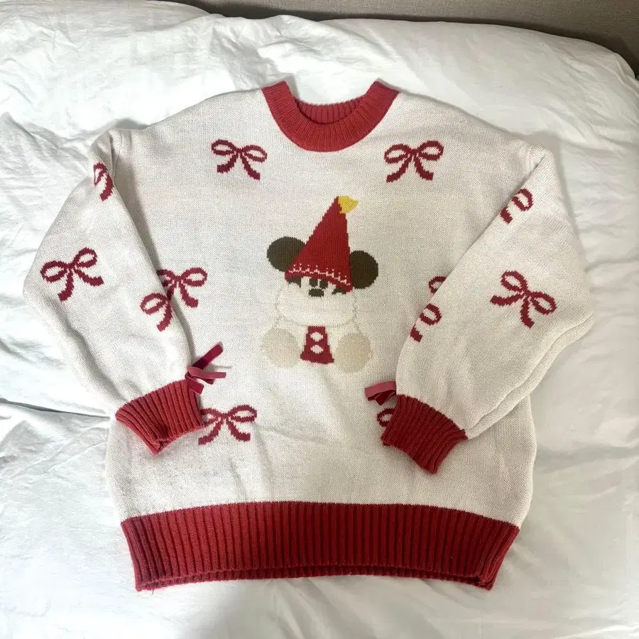 1회 착용했습니다. 얼룩, 오염 등 없습니다. - 색상: 화이트와 레드 - 디자인: 미키 모자를 쓴 캐릭터 자수 - 소재: 니트 - 소매: 리브 니트 소매 - 밑단: 리브 니트 밑단 방문해 주셔서 감사합니다.
